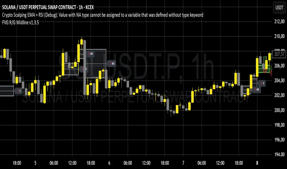Entries are only considered on a midline touch **after** a minimum 1.5× pre-move (relative to gap size); it auto-plots Entry/SL/TP with R\:R boxes and labels, and paints the FVG red if the stop is hit.