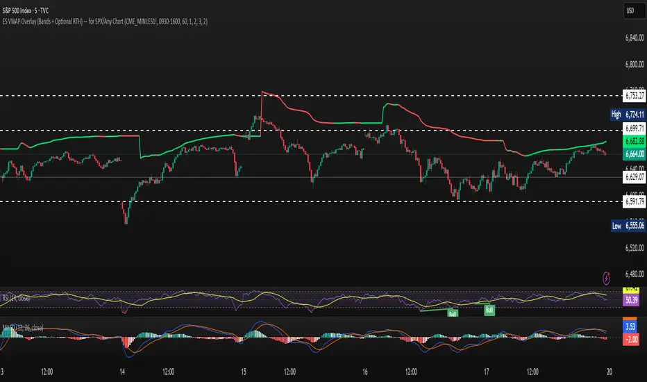 VWAP indicator for SPX. Since SPX does not have volume (index) it's using /es to mimic SPX volume. I find it good for day trading