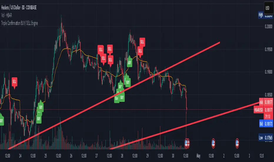 Triple Confirmation BUY/SELL Engine — v1.0This script combines MACD, RSI, VWAP, ATR, and candlestick reversal patterns into one adaptive swing-trading system. It offers full user control over confirmation filters to tailor signals to any style — from scalping to position trading.