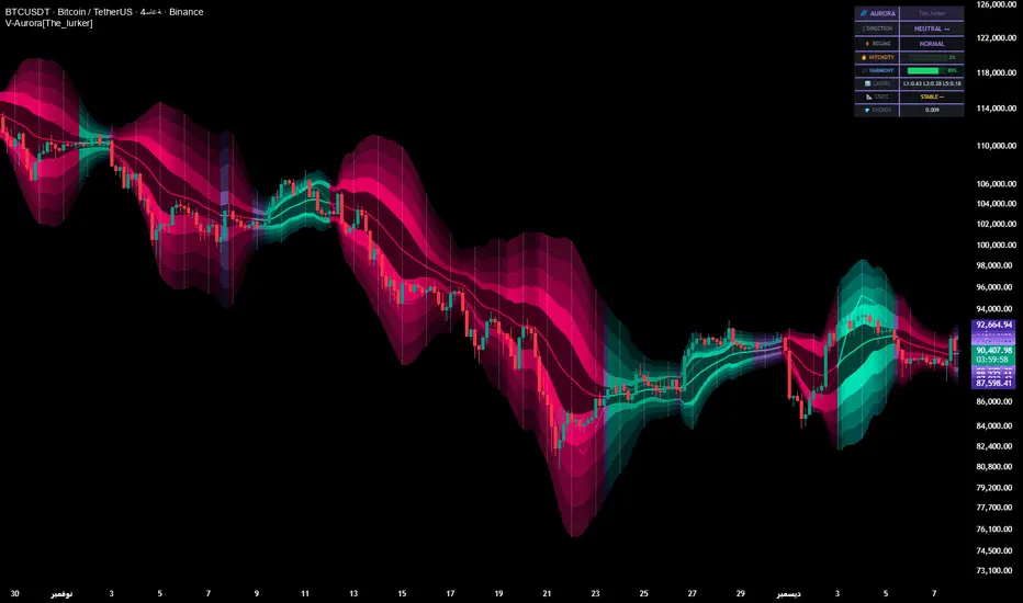 Unlike traditional volatility indicators that provide a single value, Volatility Aurora creates a 𝗺𝘂𝗹𝘁𝗶-𝗱𝗶𝗺𝗲𝗻𝘀𝗶𝗼𝗻𝗮𝗹 𝘃𝗼𝗹𝗮𝘁𝗶𝗹𝗶𝘁𝘆 𝗳𝗶𝗲𝗹𝗱 using five distinct ATR layers based on Fibonacci periods: