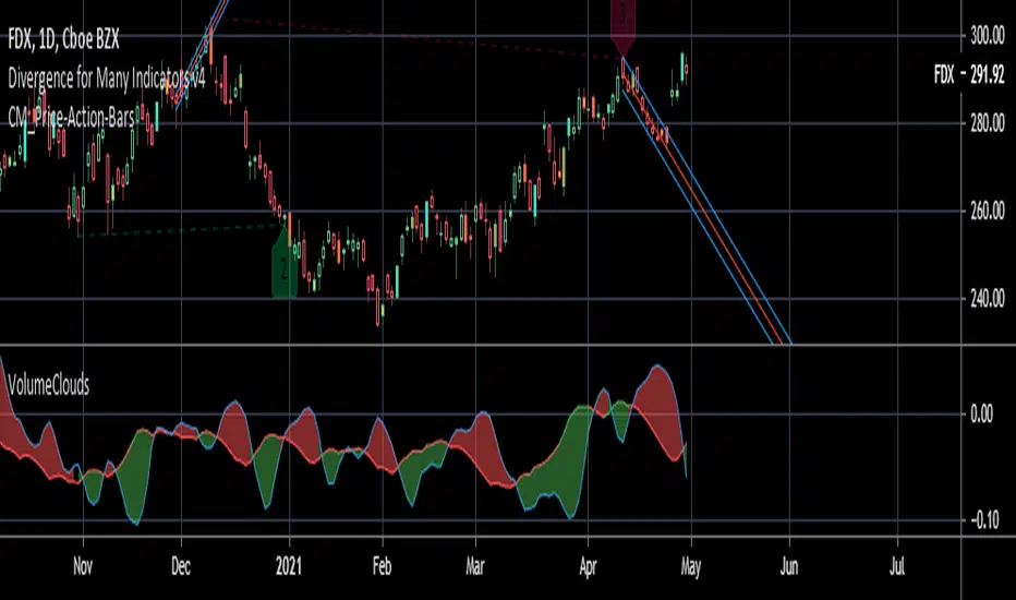 Volume clouds is a unique tragedy that predicts trend strength with normalized price and volume data, this allows us to quickly respond to small price movements than a traditional EMA cloud stragedy.
