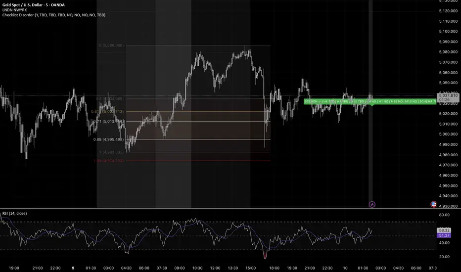 It provides a structured, visual framework to validate trade setups across multiple timeframes by tracking session bias, higher- and lower-timeframe directional alignment, Fibonacci zone confluence, and overall market structure or schema.