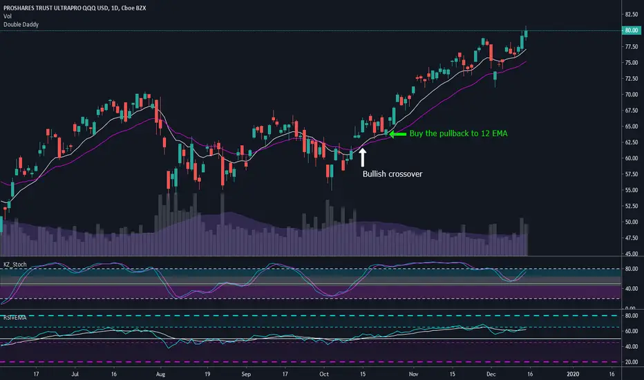 This is a super simple strategy that I use when I miss an entry based on other indicators, or if I've been on a losing streak and I need an easy win. Wait for the 12 EMA to cross above the 26 EMA, and then buy when price pulls back to the 12 or 26 EMA. I prefer to exit my trades based off divergence on the stochastics or RSI, but if you miss that exit then wait for the 12 to cross below the 26 and sell when price to pulls back up to the 12 EMA.