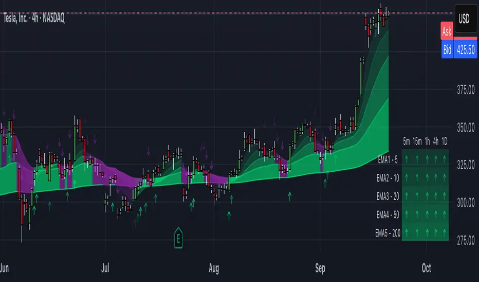 EMA Plots: Five colored lines on the chart (EMA1 shortest, EMA5 longest). Color changes based on direction: uptrend (your selected up color) if rising, downtrend (down color) if falling.