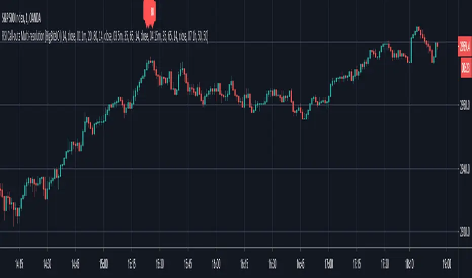 This RSI overlay help easily call-out overbought and oversold candles on a chart where other RSI values on larger resolutions/timeframes are also oversold/overbought without sacrificing screen space for a traditional RSI indicator that is not overlayed on the chart.