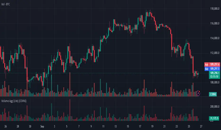 Volume Aggregated (Lite) is a lightweight yet powerful tool designed to provide traders with a consolidated view of trading volume across major perpetual futures markets. Instead of relying solely on the volume of a single exchange, this indicator aggregates and normalizes data from multiple venues, giving a broader and more representative measure of market activity.