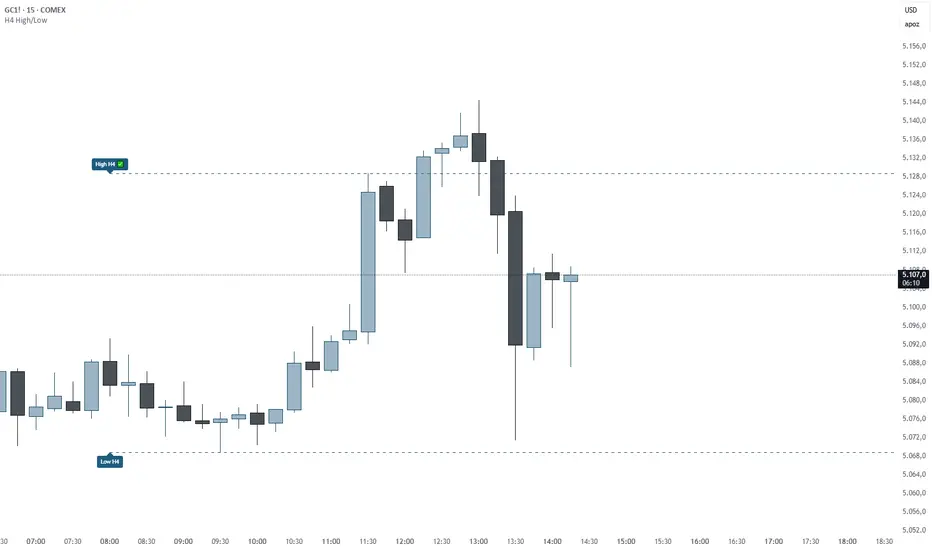 The indicator marks the high and low of the last closed H4 candle and allows you to set an alert to notify you when the price clears one of those two levels.