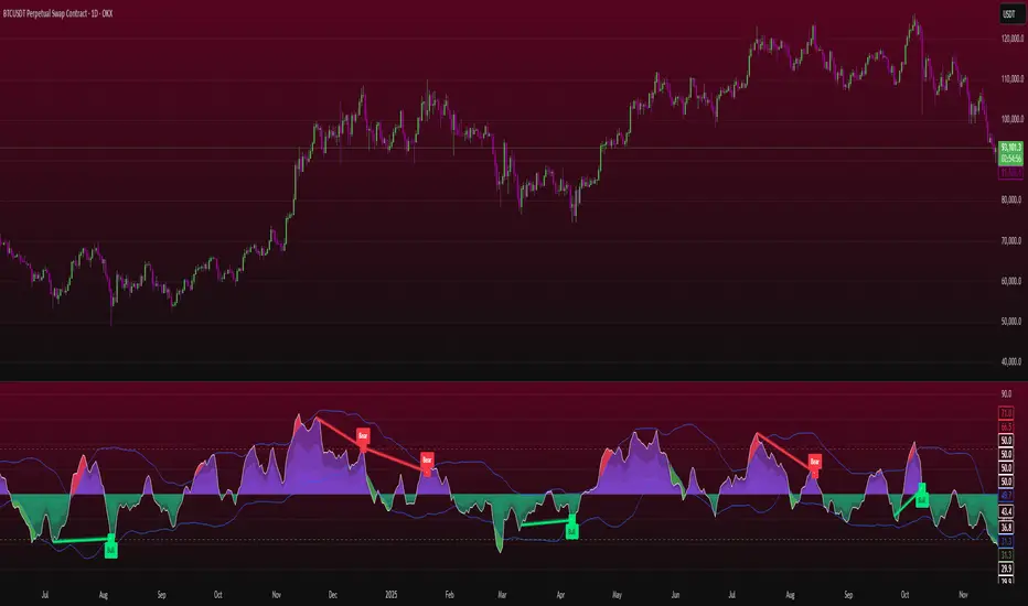 - RSI must re-enter the band with directional confirmation (positive slope for bullish, negative slope for bearish)