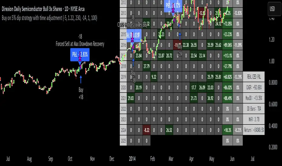 This script is a strategy called "Buy on 5% Dip Strategy with Time Adjustment 📉💡," which detects a 5% drop in price and triggers a buy signal 🔔. It also automatically closes the position once the set profit target is reached 💰, and it has additional logic to close the position if the loss exceeds 14% after holding for 230 days ⏳.