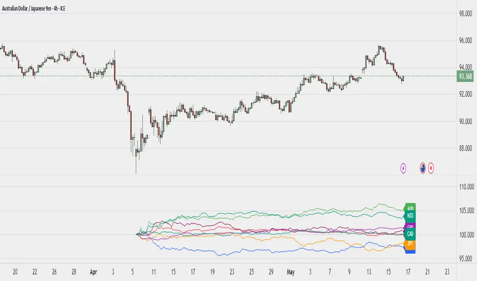 This indicator shows how individual FX major currencies (including CNY) have performed relative to each other. It calculates each currency's performance against a "Trade Weighted" basket of other major currencies.