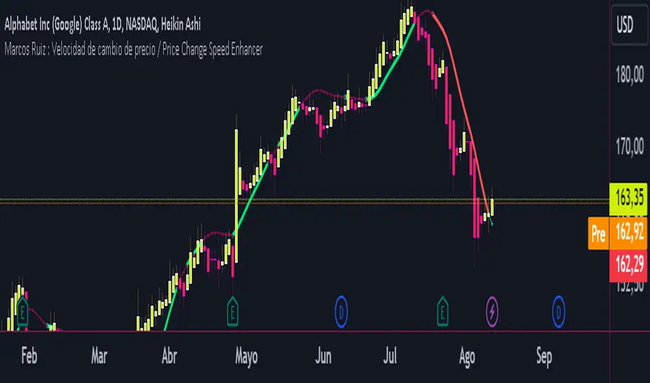 Dynamic Coloring: The moving average line's color changes based on the speed of price change
