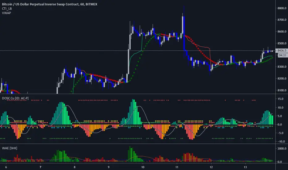 - Coral Trend from Lazybear (tradingview.com/script/qyUwc2Al-Coral-Trend-Indicator-LazyBear/) is included as indication dots (red/green dots below/above the Derivative Oscillator histogram