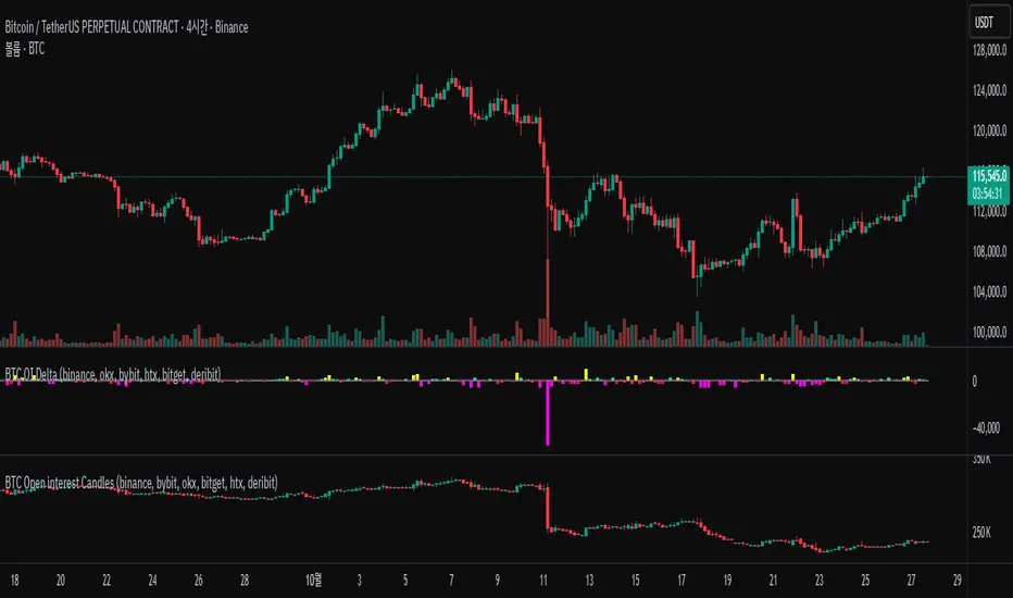 This Pine Script indicator fetches real-time Bitcoin (BTC) perpetual futures open interest (OI) data from major cryptocurrency exchanges (Binance, OKX, Bybit, Bitget, HTX, Deribit), aggregates it, and visualizes it as candlesticks on the chart. Each candlestick represents the combined OI values at the open, high, low, and close of that bar. Candlestick colors change based on whether the current bar’s close OI is higher or lower than the previous bar’s, allowing intuitive tracking of OI fluctuations.
