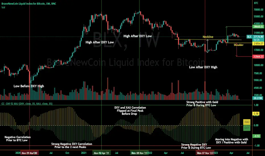 The intention is that you might be able to determine future direction of Bitcoin based on positive or negative correlations of Gold and/or the US Dollar Index. DXY has been making peaks and valleys prior to Bitcoin since after March 2020 black swan event, where it peaked just after instead. In the future, it may flip over again and Bitcoin may hit major highs or lows prior to DXY, again. So, keep an eye on the charts for all 3, as well as the indicator correlations.