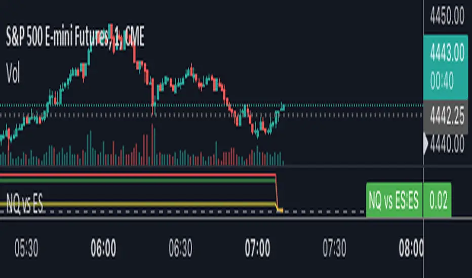 The script shows the spread between the realtime NQ and ES percentage change from the day before, from which it is possible to see if NQ is outperforming or underperforming the ES.