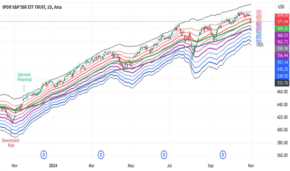 It is intended to be used for short term trading or long term investing with a daily market index chart such as SPY and multiple exchange traded funds that track said market index. A different ETF is purchased when a daily SPY candle reaches a lower buy band using 10% of a total account value. The sale of any ETFs is at the discretion of the trader and dependent on investment strategy (short term trading or long term inventing) and the trend. When short term trading in a downtrend or when daily candles are below the 50 EMA, selling would be done every 2 to 3 bands above a buy to mitigate the risk of a significant portion of an account getting caught in a downtrend. In an uptrend the High Band would be used to sell any holdings.