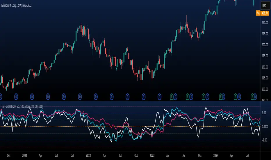 "Tri-Fold BB" is an indicator that utilizes three Bollinger Bands, each of different length as a way to represent trend strength. This allows one to see the trend strength relative to multiple timeframes: short, mid, and long term trend strength. This is helpful because it provides the user with a holistic view of the asset.