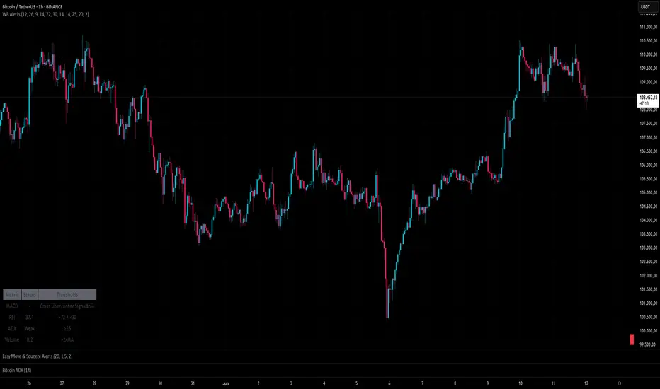 Six individual alertcondition() calls: MACD ↑/↓, RSI Overbought/Oversold, ADX Strong Trend, Volume Spike.