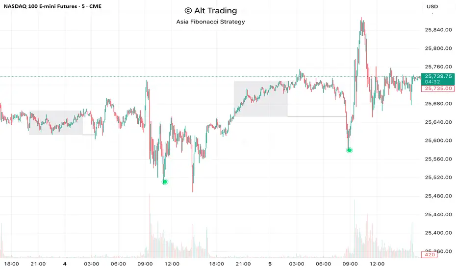 The Alt Trading: Asia Fibonacci Strategy is a session-anchored liquidity and Fibonacci engine designed for traders who want to systematically exploit the overnight Asia range instead of just marking it and guessing. It automatically profiles the Asia session to build a precise high–low liquidity band, then waits for clean sweeps of that range before it will even consider a setup forcing every idea to start from an objective liquidity event. Behind the scenes, a swing-based structure model defines the dominant leg and projects a true, directionally-aligned Fibonacci map, extending down for long scenarios and up for shorts so the premium/discount zones are never “mirrored” or visually inverted. Key extension bands are converted into forward-projected price zones, with dedicated entry corridors that only activate once price has both raided the Asia high/low and traded back into the correct Fibonacci pocket. A lightweight FVG engine tracks the most recent opposing Fair Value Gap and uses its invalidation as a final confirmation step, so your long setups only trigger when a bearish imbalance has been meaningfully reclaimed and vice versa for shorts. The result is a minimal but strict playbook: sweep the Asia range, respect the leg, touch the fib zone, invalidate the opposing FVG, then and only then print a clean visual marker on the chart. Transparent fib blocks, trigger FVG highlights, and compact “double-circle” text markers keep the chart readable even on lower timeframes, while still giving you a clear sense of where the setup originated and which liquidity it’s built around. All colors and visual layers are customizable, making it easy to blend the tool into your existing layout while preserving the core logic. Rather than trying to predict the entire session, Asia Fibonacci Strategy turns one of the most consistent structures in the market overnight range and its sweep into a repeatable, rule-driven framework for high-quality intraday entries.