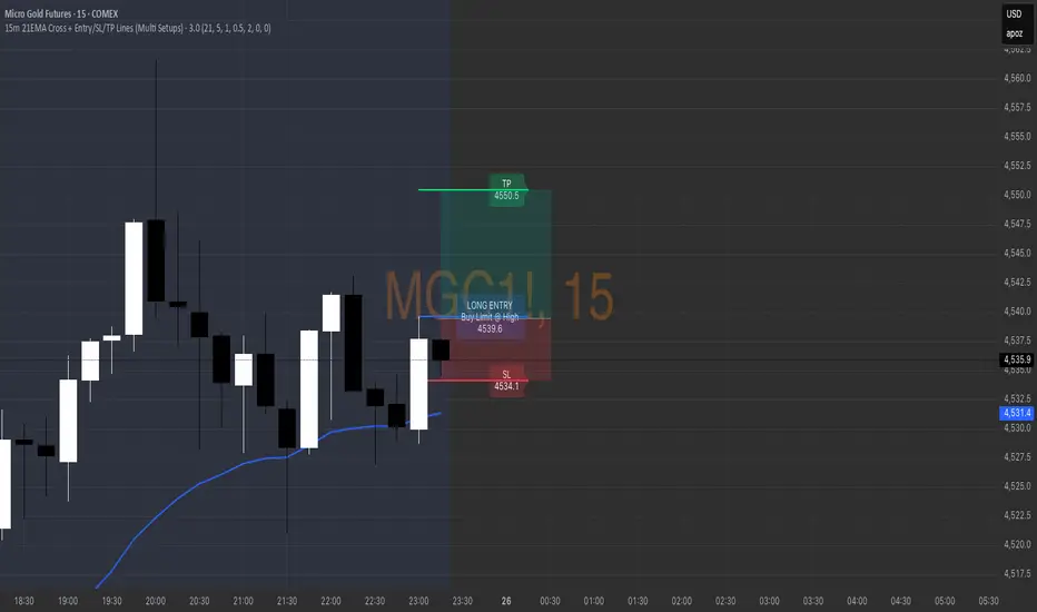 This indicator is designed to visually plan structured, rule-based trades using a 15-minute timeframe & 21 EMA cross during the overnight session (8:00 PM – 4:00 AM EST).