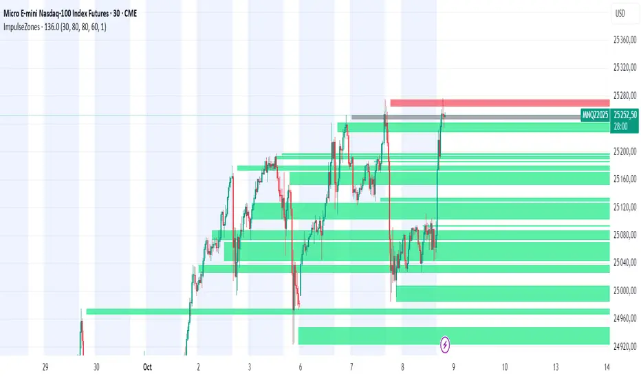 The Impulse Top/Bottom Zones indicator automatically identifies key supply and demand areas formed by strong impulsive moves.It highlights breakout and reversal zones to help traders visualize potential reaction points in trending or ranging markets.