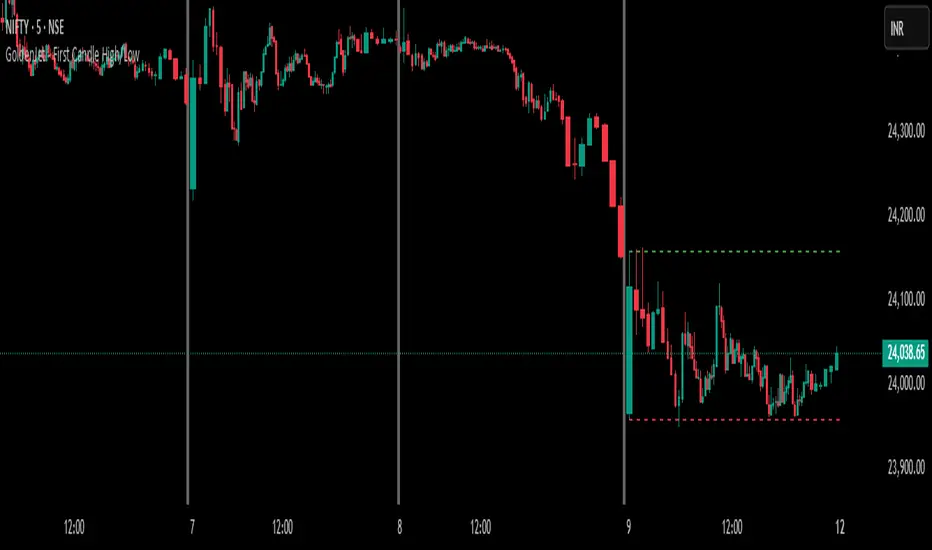 The "First Candle High/Low" indicator is a custom intraday trading tool designed for use on intraday charts (e.g., 1-minute, 5-minute, 15-minute). It automatically marks the high and low of the first completed candle of the trading day using horizontal dashed lines. These lines are extended visually across the chart until the end of the day, allowing traders to reference them easily throughout the session.