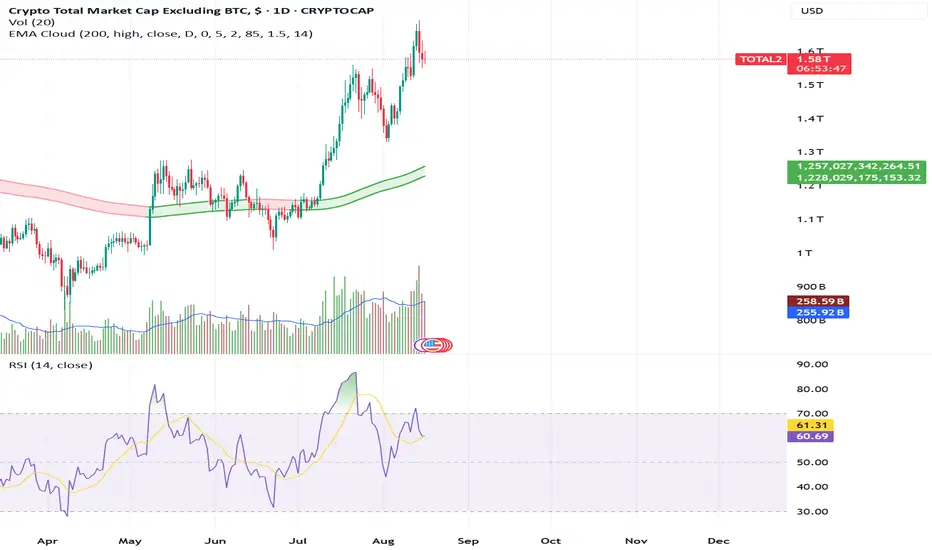 A Pine Script v6 indicator plotting a smoothed cloud between EMA 200 of high and close prices, with dynamic colors (green/soft red) based on price position. Includes RSI (14) in a subpanel for confluence, with an ATR filter to hide the cloud during high volatility.