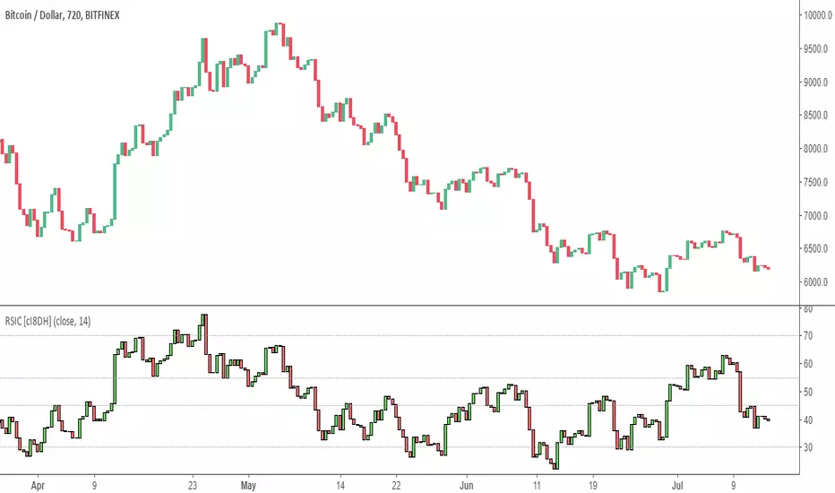 I have seen two other RSI candles, but their implementation is not correct. The high on RSI usually matches the low on price and vice versa. I have completely turned off the wicks so you can safely use this indicator as a replacement for regular RSI.