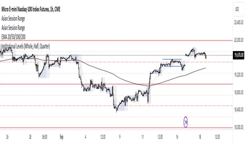 This Pine Script indicator is designed to plot institutional levels, which are key price levels that traders often monitor. These levels include whole numbers (like 12000, 12500), half levels (like 12250), and quarter levels (like 12375). The script allows full customization of colors, line styles, and line widths for each type of level (whole, half, and quarter).