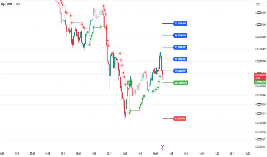 Typical use: Wait for a flip → take CALL or PUT near Entry → manage risk with SL and scale out at TP1–TP5. Enabling “after close” reduces noise; intrabar mode enables faster entries but can change before the bar closes.