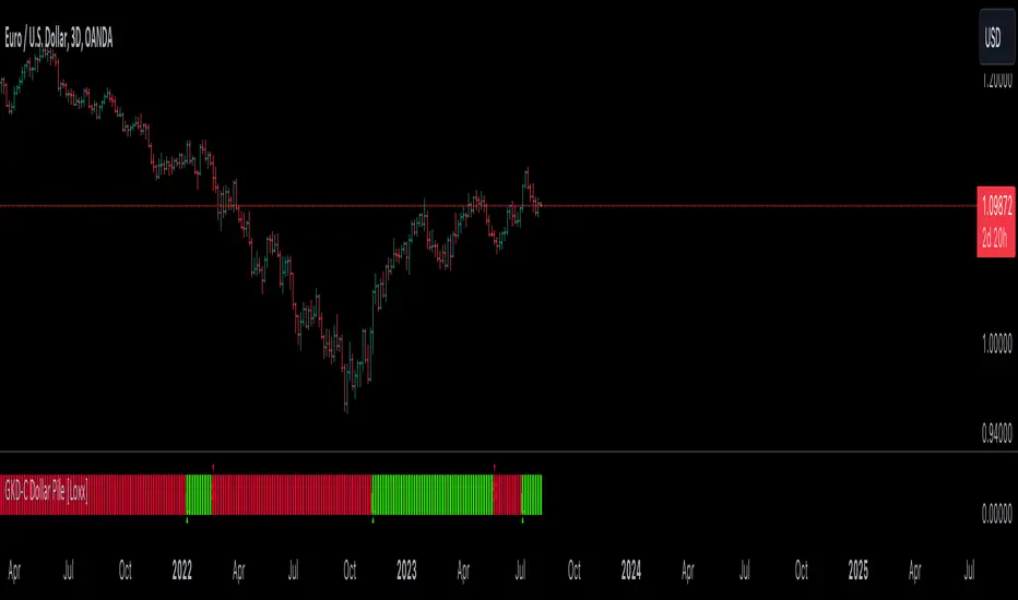 Dollar Pile applies a custom strategy using Bollinger Bands, calculated from an asset's closing price. Based on the closing price's position relative to the bands, trading signals are produced. The bands can be further adjusted based on these signals. The outcome is visualized as a histogram, colored either green or red, representing the trading signal's direction.