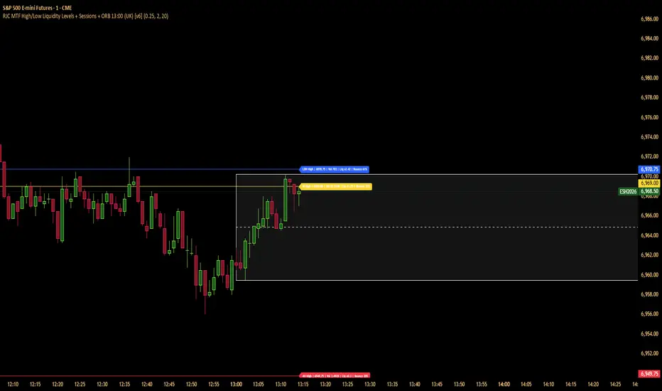A multi-timeframe liquidity map designed for intraday futures trading (especially US open) with UK-session context. It automatically plots key HTF highs/lows, Asia and London session extremes, and a 13:00–13:15 UK Opening Range (ORB) with midpoint. It also estimates “bounce likelihood” and a directional lean using simple, transparent proxies (confluence, rejection, relative extreme volume, and ATR-based distance).