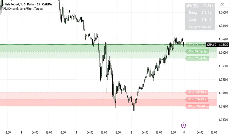Displays dynamic long & short targets calculated from current daily high/low ± 80/90/100% of the 5-day Average Pip Movement (APM – average true daily range of the last 5 completed days)
