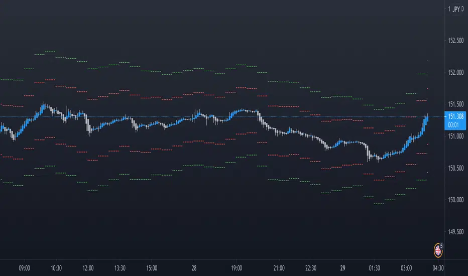 This indicator uses the ATR to give areas where the user might want to take profit or set a stop loss.