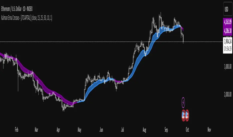 Kalman EMA Crosses - [JTCAPITAL] is a modified way to use Kalman Filters applied on Exponential Moving Averages (EMA Crosses) for Trend-Following.