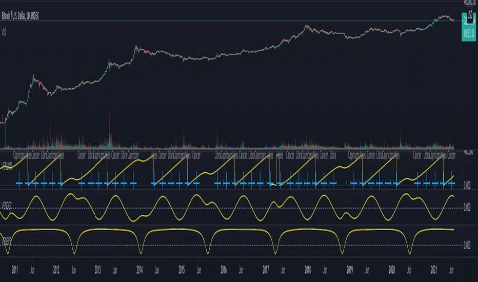 Venus speed phases (stationary and retrograde) are essential to determine a market corrections or consolidation periods, we can see that for BTCUSD, in the majority of the historical occurrences, when Venus speed decelerated, a price dip or consolidation period formed. Once the Venus average speed resumed, there was a continuation of the main trend. When the speed deceleration coincide with Venus in South declination (observe the Venus Declination indicator), the corrections was more intense, however, we don't have enough past observations to determine if this astro setup is significant we will keep watching future occurrences to confirm.