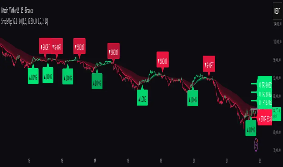 SimpleAlgo V2.1 combines momentum waves, volatility envelopes, key price levels, and optional entry markers to provide a structured view of market behavior. The tool is designed to help traders interpret trend conditions, momentum shifts, and volatility expansion or compression through a clean set of visual components.