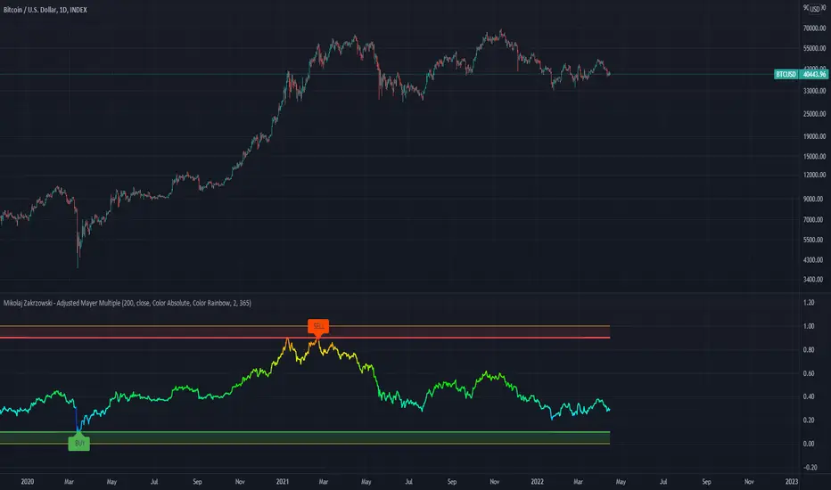 My friend, Mikolaj Zakrzowski, decided to modify and adjust this indicator so that it could be normalized. This procedure allows for easier interpretation, and clear signals of the end of the ups and downs of a given Bitcoin cycle.