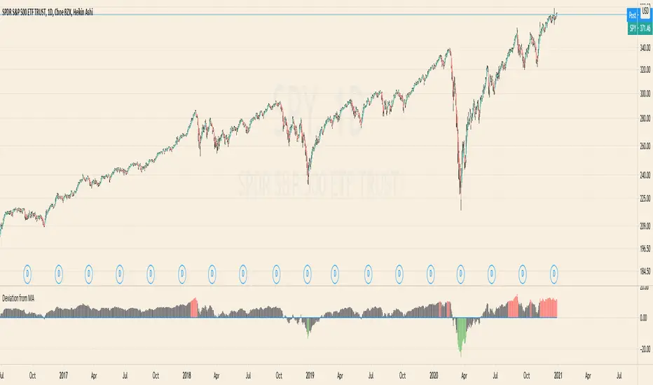 The Script calculates the Percentage Deviation to the MA and prints it as an Oscillator.