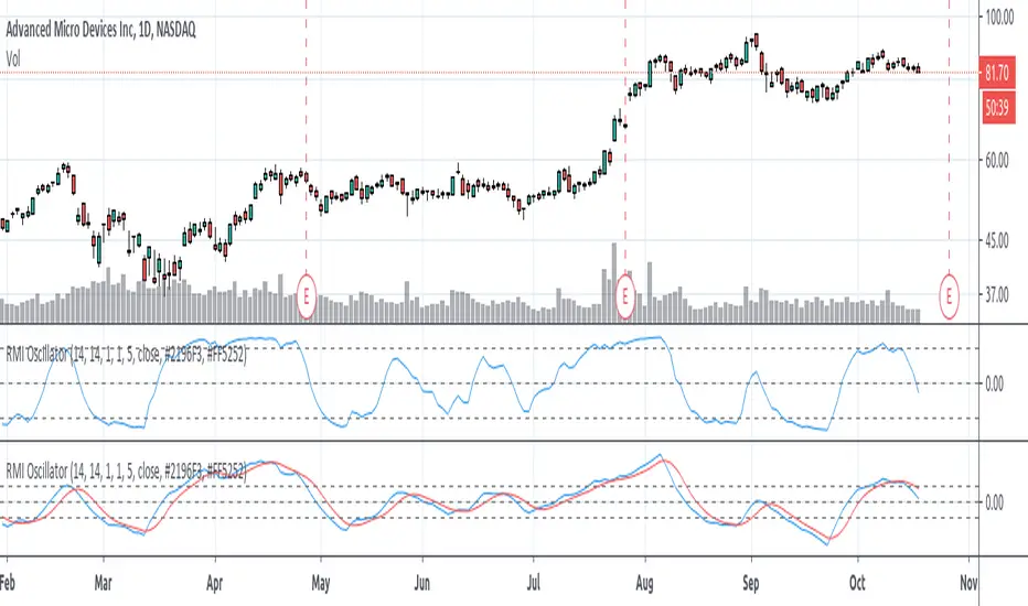 I paired the RMI with the oscillation method the Fisher Transformation uses to oscillate the value from -1.0 to 1.0 instead of the Stochastic way of 0 to 100. This way you can enable the Fisher transform, if desired. But I also just prefer the appearance of that.