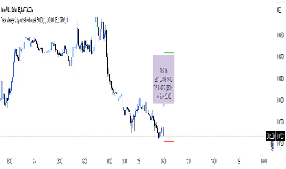 Hi Traders,this manager will make it easier for you to enter lots into your trading platform. Just go to the indicator settings, set your trading account amount, RRR, % risk and then give ok. If you then know where you want to put the stop loss then reopen, enter the value and hit ok again. The chart will show you exactly the stop loss and take profit as you wanted. The stop loss will always stay where you enter it and the take profit will move with the lot size as the price goes further or closer to the stop loss.