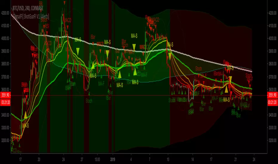 In order to help give our members awareness of how major indicators move market price action, we created ShotGunFI. This script provides signals for the following indicators and gives a customizable framework for the user to track how certain indicators impact price and further how those impacts could relate to their overall strategy. We took the major indicators that are used in the market and smashed them into one chart with one indicator so that you can visualize a broad spectrum of strategies that are already driving price action.