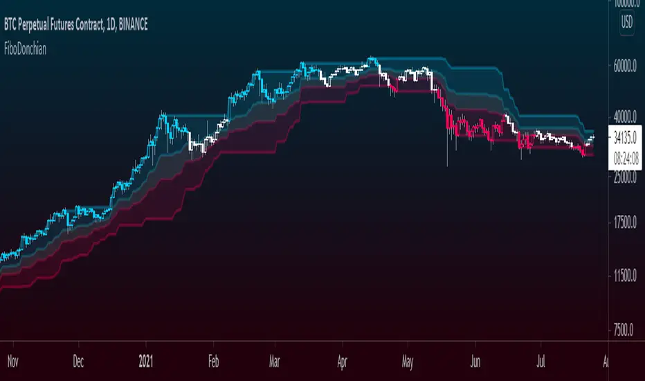 In the FiboDonchian, the channel is divided into 3 zones according to Fibonacci levels: