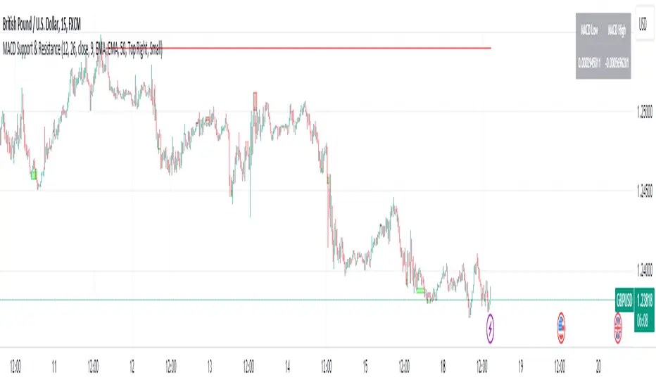 The MACD Support & Resistance indicator is an enhanced tool to better visualize potential supply (resistance) and demand (support) zones based on the MACD indicator. It combines the strength of the MACD with recent price highs and lows to depict potential breakout or reversal areas in the market.