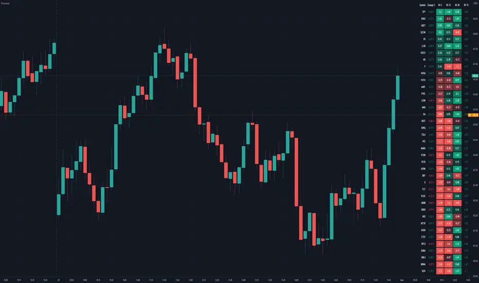 It provides a customizable watchlist / heatmap with relative strength and relative volume calculations for up to 38 tickers on multiple timeframes with a single indicator.
