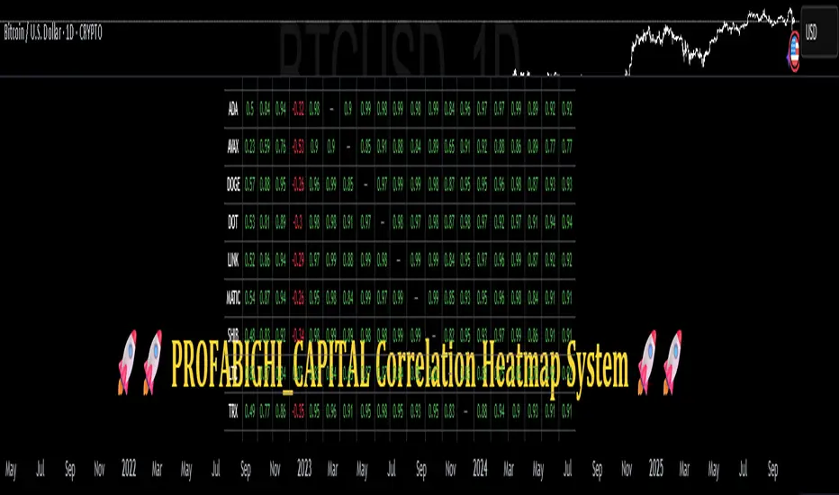 The PROFABIGHI_CAPITAL Correlation Heatmap System is an institutional-grade multi-asset correlation visualization tool engineered for cryptocurrency traders seeking to dissect inter-asset dependencies and portfolio risk clustering through dynamic, rolling correlation matrices or benchmark-focused comparisons. By computing Pearson correlation coefficients over adjustable lookback periods across up to 20 symbols, it generates color-coded heatmaps highlighting positive (green) or negative (red) relationships, while the single-asset mode benchmarks against a primary symbol (e.g., BTC) to reveal relative strength hierarchies[/b>, top/bottom extremes, and diversification insights—empowering users to optimize allocations, detect co-movement risks, or uncover decoupling opportunities in volatile markets with real-time table updates and symmetric visualizations.