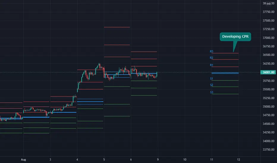 This Scripts shows the developing CPR for the selected timeframe for Daily, Weekly, Monthly or Yearly time frame. One can select the time frame using the well-organized settings.