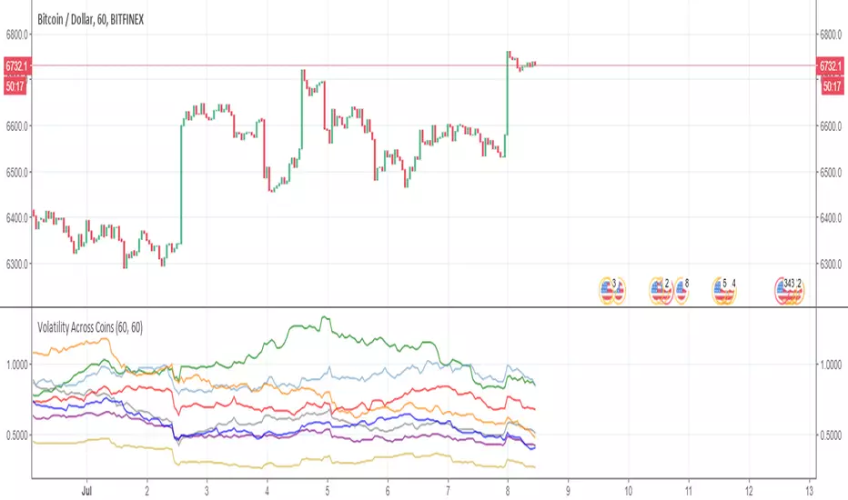 Compare the recent volatility of 8 cryptocurrencies, based on percentage change per candle.