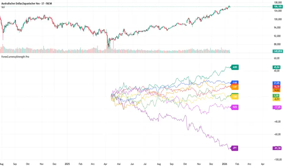 Instead of focusing on single pairs, the indicator provides a cross-market view of currency dynamics, helping to identify broad leadership, persistent trends, and divergence between major FX blocs. It is designed as a context and comparison tool, not a direct trading signal, and works best for macro-oriented FX analysis, relative value setups, and portfolio positioning.