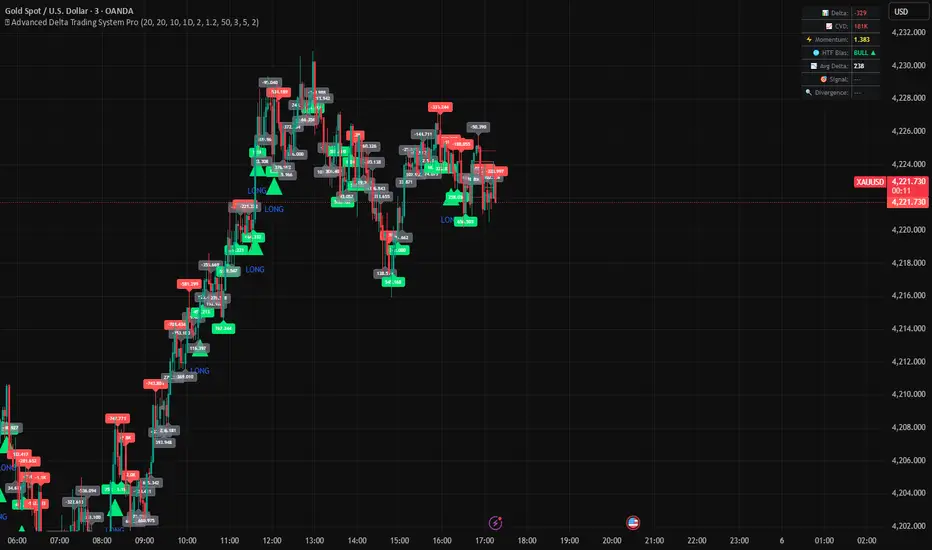 This indicator is an advanced order flow analysis tool that combines Delta Volume Analysis, Cumulative Volume Delta (CVD), Multi-Timeframe Trend Confirmation, and Volume Profile Zones to identify high-probability trading opportunities based on institutional buying and selling pressure.